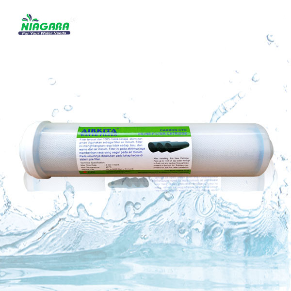 Inline CTO FIlter= CTO Carbon filter umumnya digunakan sebagai pre filter dan juga sebagai post filter sistem pengolahan air minum. CTO Carbon filter terbuat dari 100% batok kelapa alami dan aman digunakan sebagai filter air minum. CTO Carbon filter menghilangkan rasa tidak sedap, bau, dan warna dari air minum. CTO Carbon filter juga menghilangkan sisa chlorine/kaporit, melindungi air minum kita dari trihalomethane (THM) yang merupakan bahan kimia berbahaya efek dari penggunaan chlorine. CTO Carbon block juga mengurangi zat organik, pestisida, dan kimia lainnya dari dalam air. CTO Carbon block pada akhirnya juga memberikan rasa yang segar pada air minum.